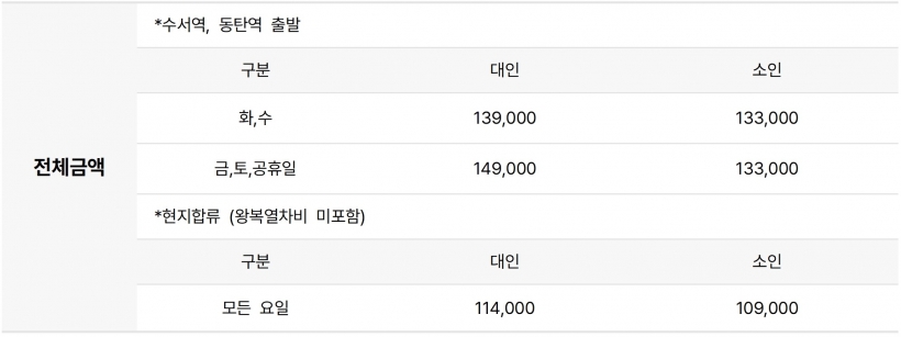 왕복SRT열차비, 연계차량비,중식, 입장료, 인솔안내비 |