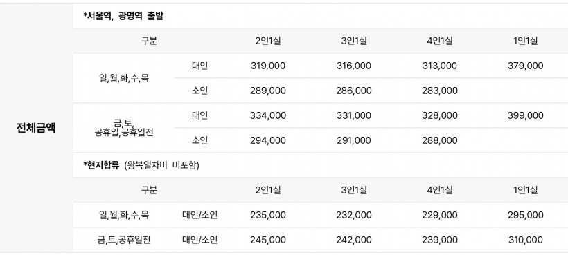 ※여행 중 제공되는 식사는 4인 기준으로 차려지며, 2인 또는 홀수 인원으로 예약 시 다른 일행과 함께 식사를 하오니 참고 바랍니다.