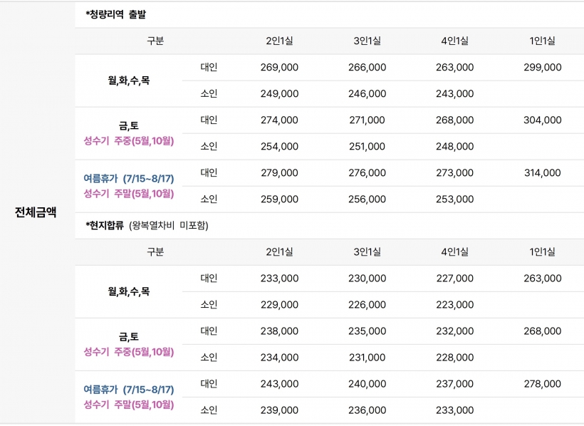 왕복 KTX이음 열차비, 연계차량비, 숙박(모텔급), 식사(4식), 레일바이크, 케이블카, 입장료, 가이드비. |