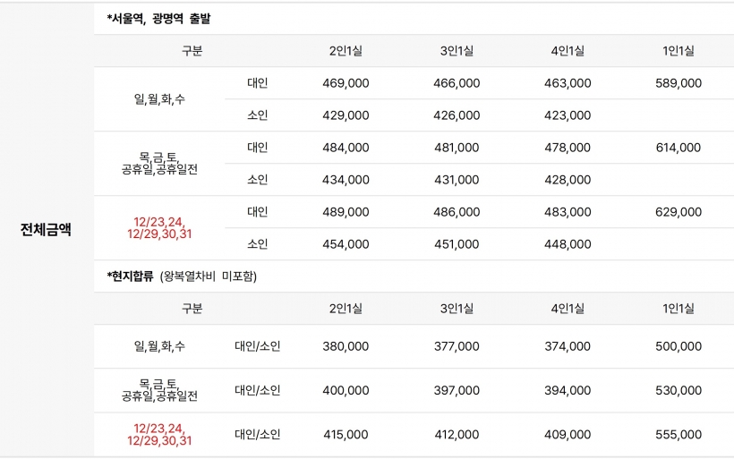 ※여행 중 제공되는 식사는 4인 기준으로 차려지며, 2인 또는 홀수 인원으로 예약 시 다른 일행과 함께 식사를 하오니 참고 바랍니다.