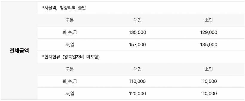 왕복(KTX+ITX마음)열차비, 연계차량비, 입장료, 중식, 석식(한우), 인솔안내비 |