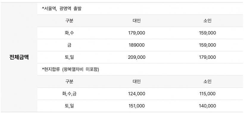 왕복KTX열차비, 연계차량비, 입장료, 중식, 안내인솔비. |