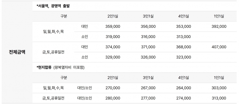 ·모이는 장소 | 개별탑승 (출발1~2일전 승차권 /일정표 문자발송) |