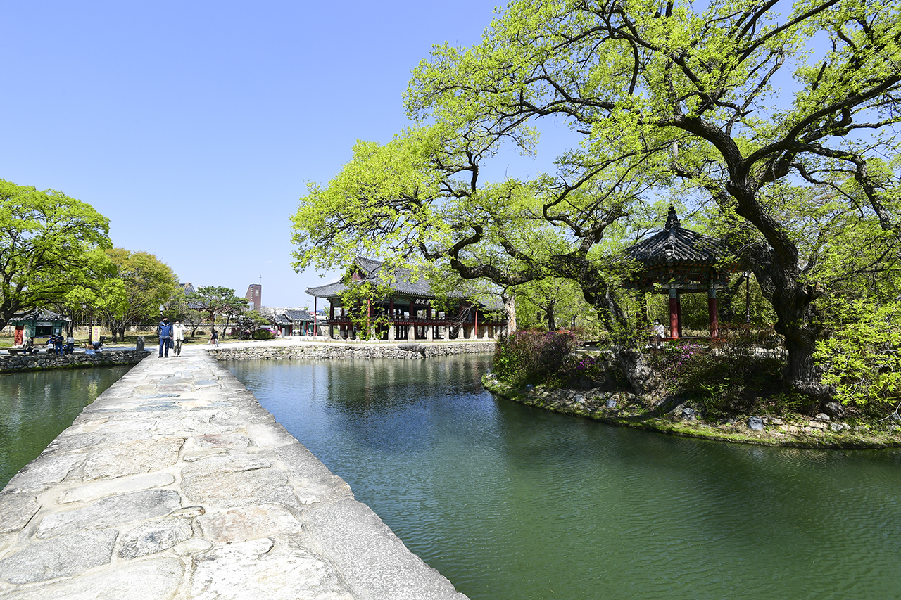 누원의 북쪽으로는 교룡산이 우뚝 서 있고, 남쪽에는 금괴같이 보배롭다는 금암봉이 있으며 멀리 지리산이 보인다. 광한루원은 은하수를 상징하는 연못가에 월궁을 상징하는 광한루와 지상의 낙원인 삼신산이 함께 어울려 있는 아득한 우주관을 표현한 한국 제일의 누원이며, 경회루, 촉석루, 부벽루와 함께 우리나라 4대 누각에 속한다. 광한루원 안에는 광한루, 오작교, 완월정, 영주각, 춘향관, 춘향사당, 월매집이 있고 이외에도 공예품점, 카페 등의 부속시설이 있다. 연지에는 지상의 낙원을 상징하는 연꽃을 심고, 견우와 직녀가 은하수에 가로막혀 만나지 못하다가 칠월칠석날 단 한번 만난다는 사랑의 다리 오작교를 연못 위에 설치하였다. 이 돌다리는 4개의 무지개 모양의 구멍이 있어 양쪽의 물이 통하게 되어 있으며, 한국 정원의 가장 대표적인 다리이다. 춘향사당에는 김은호 화백이 그린 춘향의 영정을 모셔 놓았다. 해마다 음력 5월 5일 단오절에는 춘향제가 열린다. |