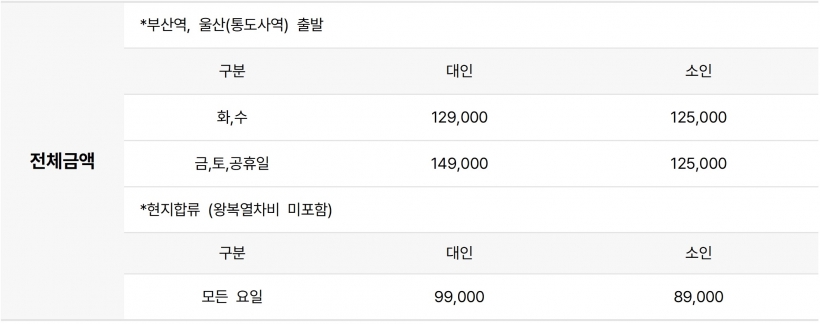 | ·모이는 장소 | 개별탑승 (출발1~2일전 승차권/일정표 문자발송) |
