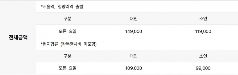 | ·모이는 장소 | 개별탑승 (출발1~2일전 승차권/일정표 문자발송) |