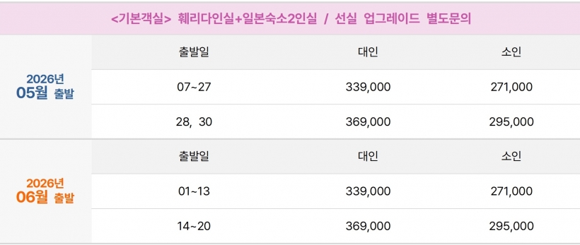 ★ 부관훼리 : 성희호 or 하마유호 ㅣ 기본선실 : 다인실 (11~22인실) → 바닥에 얇은 메트리스가 깔려 있으며 이불깔고 자는 형태, 화장실 공용 → 11인 이상이 한방에 들어 갈수 있는 기본 룸으로, 성별/팀 구성에 따라 선사에서 임의 배정하여 드립니다. 10명이상 단체의 경우, 가능한 한 방 배정을 기본으로 하고 있으나 선사 사정에 의해 분산 배정될 수도 있습니다. → 성희호출발/하마유호귀국 하마유호출발/성희호귀국 중 랜덤배정입니다. |