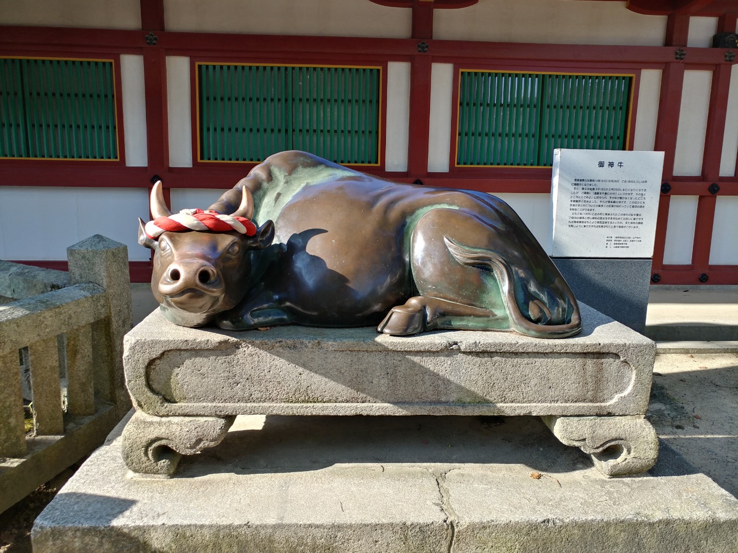 ▶다자이후 텐만구 일본의 중요 문화재로, 다자이후의 입구에 있는 소의 동상의 머리 를 만지면 머리가 맑아지고, 자신의 몸에서 건강이 좋지않은 부위 를 만지면 그 부위의 병이 낫는다는 속설이 있다.